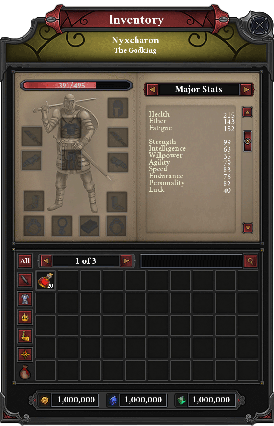 So starting out, I wanted to make use of the space I had. This immediately gives off a very Morrowind feel because it fits a lot of the criteria I set. However, it still has issues. The search bar is too small to be useful, and there isn’t enough space at the bottom for proper display of the various currencies. This is a bit of a problem, so we’ll have to change things up…