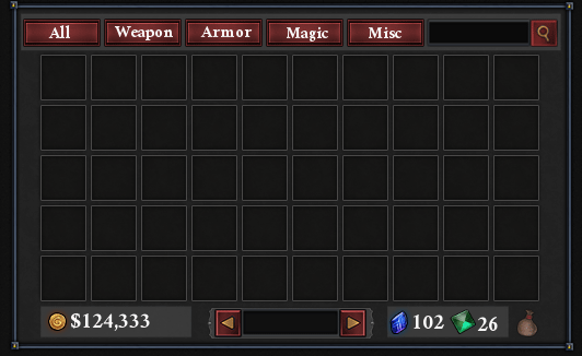 So starting out, I wanted to make use of the space I had. This immediately gives off a very Morrowind feel because it fits a lot of the criteria I set. However, it still has issues. The search bar is too small to be useful, and there isn’t enough space at the bottom for proper display of the various currencies. This is a bit of a problem, so we’ll have to change things up…